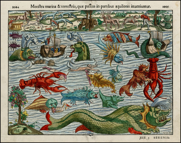 Auf der geograph. Karte von Hans Rudolf Manuel Deutsch in der Weltchronik von Sebastian Münster (1572) steht: Monstra marina & terrestria quae passim in partibus aquilonis inveniuntur: