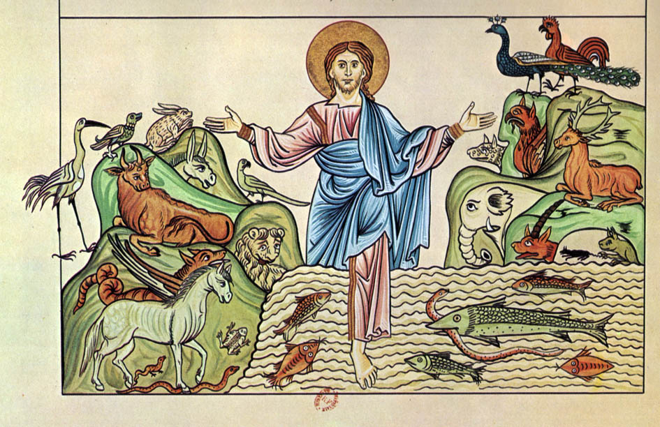 Hier die Szene Adam benennt die Tiere (1. Mos. = Genesis 2,20): Der Mensch gab Namen allem Vieh, den Vögeln des Himmels und allen Tieren des Feldes.