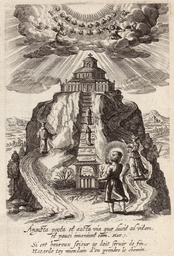 Mit den Aufstiegsschemata wird Verschiedenes gegliedert: ◢ Die Bibelstellen mit der Jakobsleiter (Gen 28) und den Tempelstufen (Ezechiel 40) △ Aufstieg über die Kreaturen zu Gott ◢ Spiritueller / aszetischer / mystischer Aufstieg Y Kombination mit anderen Bildlichkeiten ◤ dabei werden die Aufsteigenden auch von Mächten bedroht, die sie vom Weg abbringen wollen: Teufel oder Laster oder widrige Umstände ⚠ Travestie des Aufstiegs: oben negativ konnotiert / \ Verschiedenerlei Aufstieg und Abstieg ⑇ Dante ••• Bunte Sammlung von Aufstiegs-Allegorien ⋀ Lebensalter als Stufenfolge auf und ab ▟ Basiskenntnisse und höhere Studien ⏏ Mariæ Tempelgang ### Jesus steigt auf einer Leiter zum Kreuz ⍙ Die Kreaturen sind nach dem Grad ihrer Vollkommenheit geordnet Petrarca auf dem Mont Ventoux? ✒ Die Abstraktions-Stufen in der Sprache ☝Moderne Adaptationen in der Karikatur ♀♂ Erotische Abenteuer ⬇ Die Leiter wegwerfen, wenn man oben ist Hinweise auf Forschungsliteratur Jakobs TraumGenesis 28,11ff: Jakob zog aus Beerscheba weg und ging nach Haran. Er kam an einen bestimmten Ort, wo er übernachtete, denn die Sonne war untergegangen. Er nahm einen von den Steinen dieses Ortes, legte ihn unter seinen Kopf und schlief dort ein. Da hatte er einen Traum: Er sah eine Leiter*, die auf der Erde stand und bis zum Himmel reichte. Auf ihr stiegen Engel Gottes auf und nieder. Und siehe, der Herr stand oben und sprach: Ich bin der Herr, der Gott deines Vaters Abraham und der Gott Isaaks. Das Land, auf dem du liegst, will ich dir und deinen Nachkommen geben....
