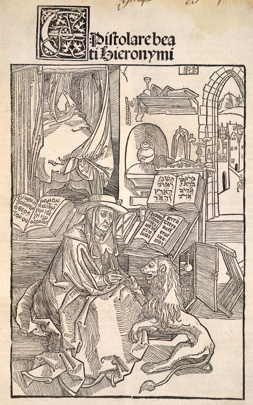 Holzschnitt als Titelblatt des Buchs Epistolare beati Hieronymi, Basel: N.Kessler 1492.