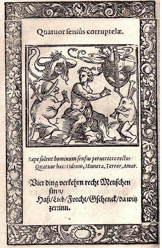 Franciscus Petrarcha, Von der Artzney bayder Glück / des guten vnd widerwertigen […]. Augspurg: H. Steyner 1532. (Aus der Ausgabe 1572; vgl. das Digitalisat der BSB > http://daten.digitale-sammlungen.de/bsb00084729/image_36 )