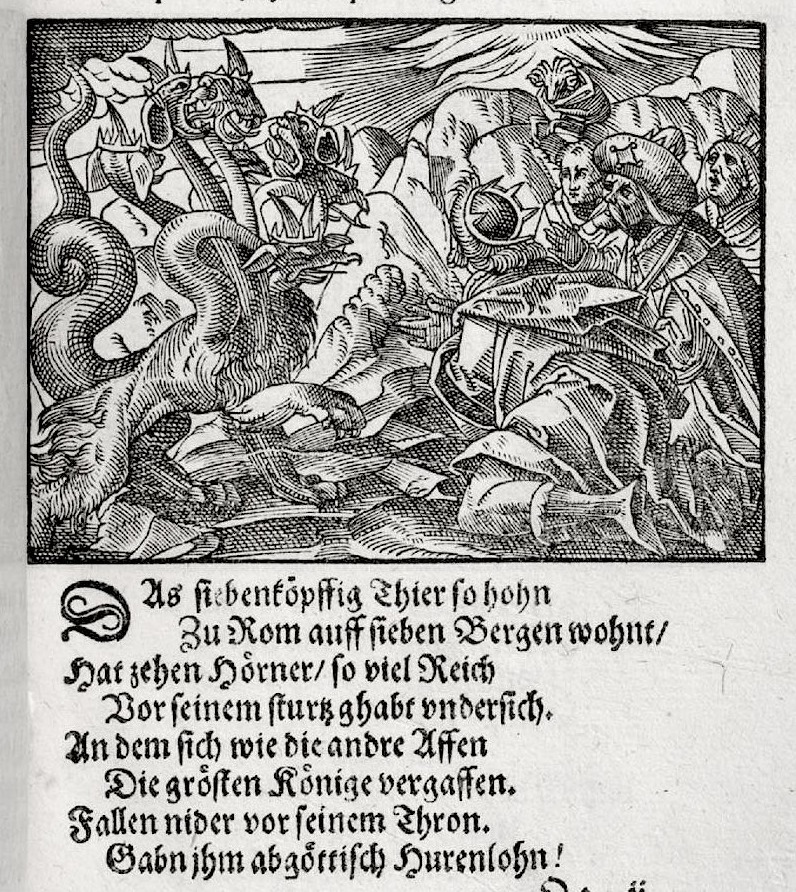 Nach dem siebenköpfigen Drachen steigt ein Tier mit zwei Hörnern aus der Erde auf, redend wie ein Drache. Wer Handel treiben will, muss sich – wie die Sklaven das Mal ihres Besitzers – das Mal dieses Tiers einbrennen lassen, seine Namenszahl.