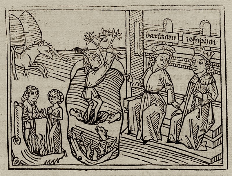 Von der ewigen Verdammnis. Barlaam erzählt, dass der Sünder einem Menschen gleiche, der – als er vor einem Einhorn floh – in einen Abgrund stürzte. Bei seinem Fall packte er mit den Händen einen kleinen Baum, der aus der Tiefe emporragte; und als er hinunterschaute, erblickte er am Fuße des Baumes einen scheusslichen Pfuhl und einen schrecklichen Drachen, der den Baum umschlängelte und mit offenem Rachen auf sein Herabfallen lauerte. Zwei Mäuse, eine weisse und eine schwarze, benagten den Baum unaufhörlich an der Wurzel, und er fühlte ihn schwanken. Vier weisse Schlangen, die aus dem Vorsprung, auf den er seinen Fuß fest eingestemmt hatte, hervorkamen, verpesteten die ganze Grube mit ihrem tödlichen Atem. Da hob er die Augen auf und erblickte einen Honigquell, der von den Ästen des Baumes herabtröpfelte, und er vergaß die Gefahr, die ihn von allen Seiten umgab, und überließ sich dem süßen Genuss. Als ihm aber ein Freund eine Leiter hinhielt, um ihm herauszuhelfen, hieß er ihn warten, von der Honigsüße berauscht, und stürzte, als der Baum fiel, in den Schlund des Drachen, der in den Pfuhl hinabkroch und ihn verschlang. So starb er eines jämmerlichen Todes.