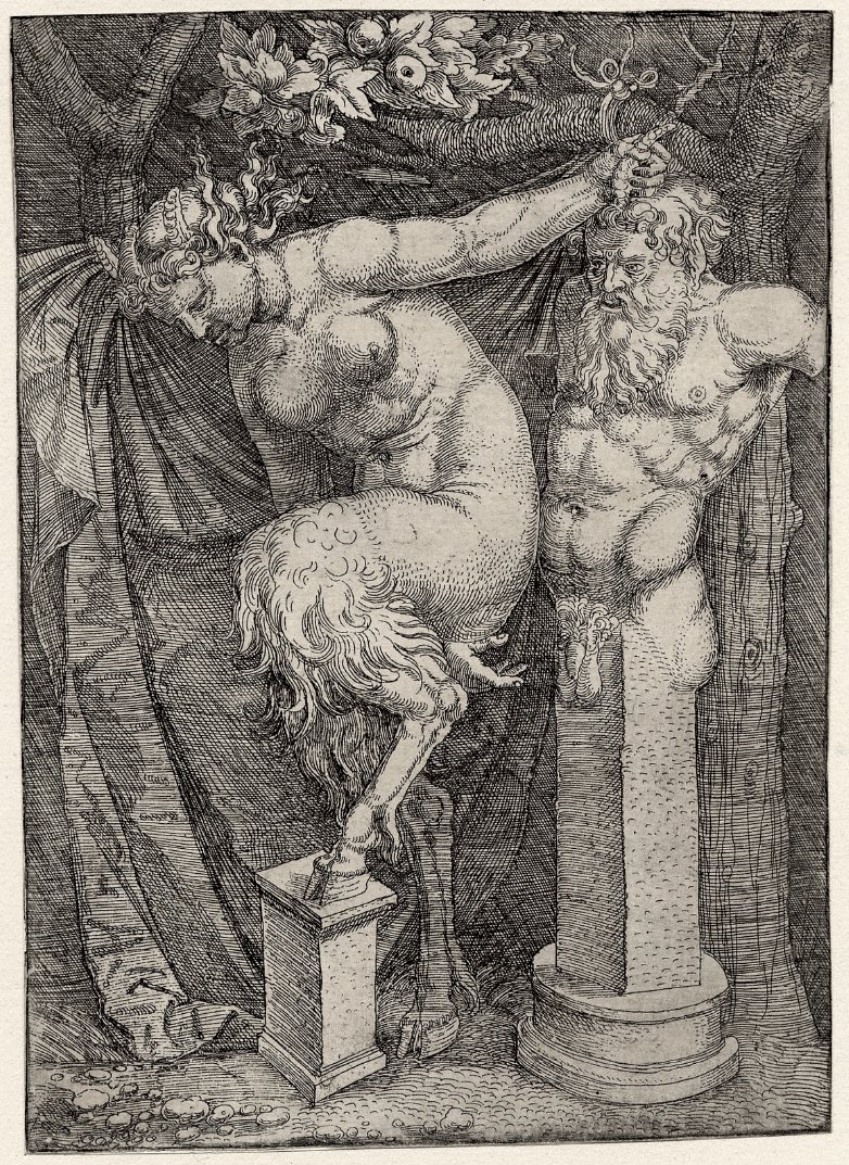 Der weibliche Satyr packt mit der einen Hand das Horn des als Statue gestalteten Priap; mit der anderen Hand greift sie nach dessen ...