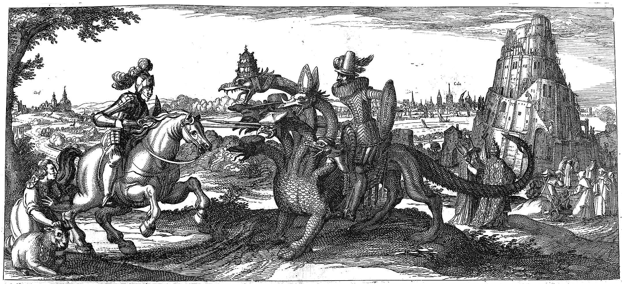 Ambrogio Spinola reitet auf dem siebenköpfigen, durch Tiara, Kardinalshut, Barett, Bischofsmütze als päpstlicher Drache gekennzeichneten Ungeheuer. (Weil die Hure Babylon auf dem apokalyptischen Tier reitet, ist rechts im Hintergrund des Bildes der Turmbau zu Babel zu sehen.)