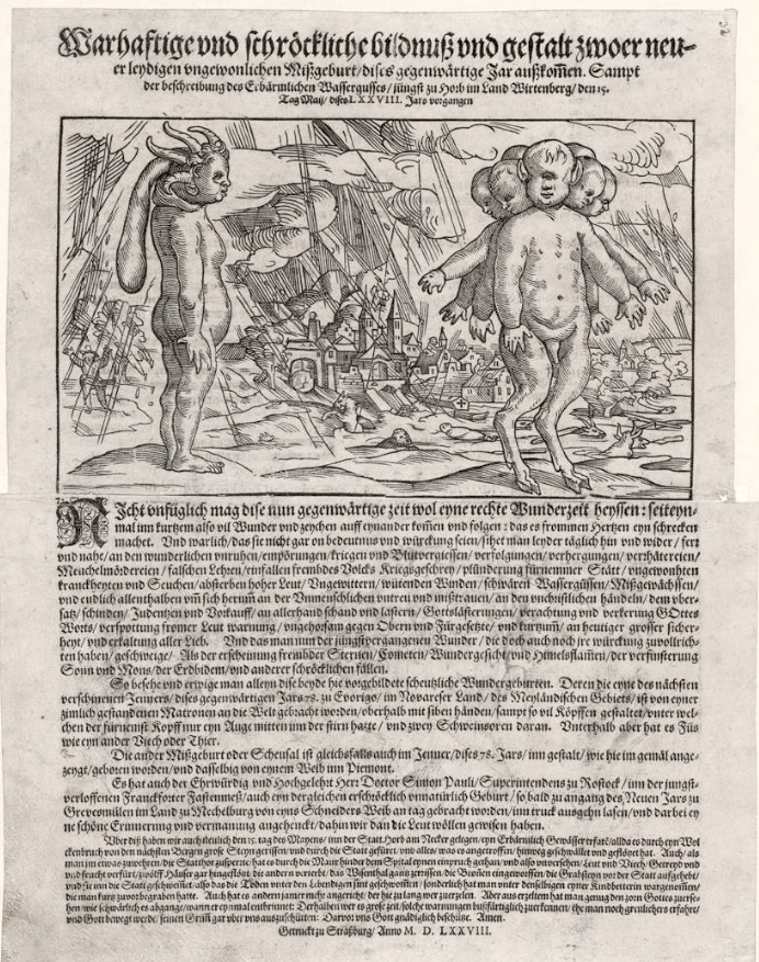 Warhaftige und schröckliche bildnuss vnd gestalt zwoer neuer leydigen vngewonlichen Mißgeburt/ dises gegenwärtige Jar ausskomen. Sampt der beschreibung des Erbärmlichen Wassergusses/ jüngst zu Horb im Land Wirtenberg/ den 15. Tag Maij/ dises LXXVIII. Jars vorgangen, Getruckt zu Straßburg: [Bernhard Jobin] 1578.