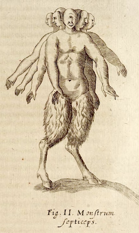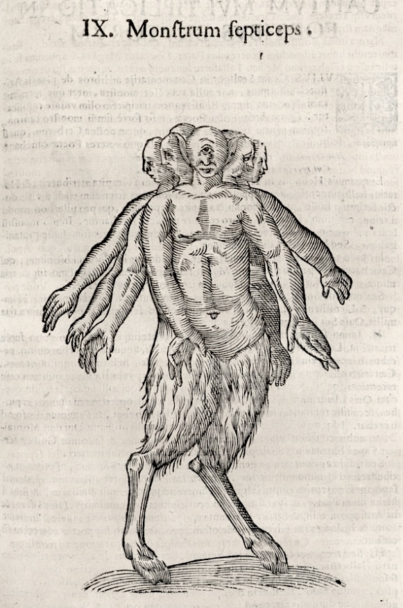Aldrovandus ait, se legisse quondam, in regione Novarensi ex muliere vetula egressum esse monstrum, cruribus & pedibus bubulis, reliquo corpore humano, cum septem brachiis, & totidem capitibus uni thoraci affixis; sed caput inter alia medium unico oculo, & auribus hircinis fuisse praeditum, prout in apposito Schema te apparet. Addit Aldrovandus, alios prodidisse, hoc monstrum heptacephalon instar hydrae, mense Januario Anni 1587. Eufigi in regione Pedemontana natum esse.