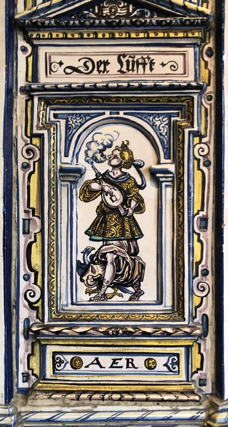 Martin de Vos (1532–1603) als Zeichner und Crispijn van de Passe (d. Ä. 1564–1637) als Stecher signieren auf diesem Kupferstich. Sie haben eine Serie zu den Vier Elementen geschaffen: Erde, Wasser, Feuer, Luft. Auf jedem Bild ist ein Paar dargestellt, umgeben von einschlägigen Attributen: Tieren, Früchten; beim Feuer (IGNIS) auch von Utensilien: hinten Arbeiter beim Bergbau, vorne einen Goldschmied bei der Arbeit mit einem Blasbalg und – so scheint es – Produkten aus seiner Werkstatt.