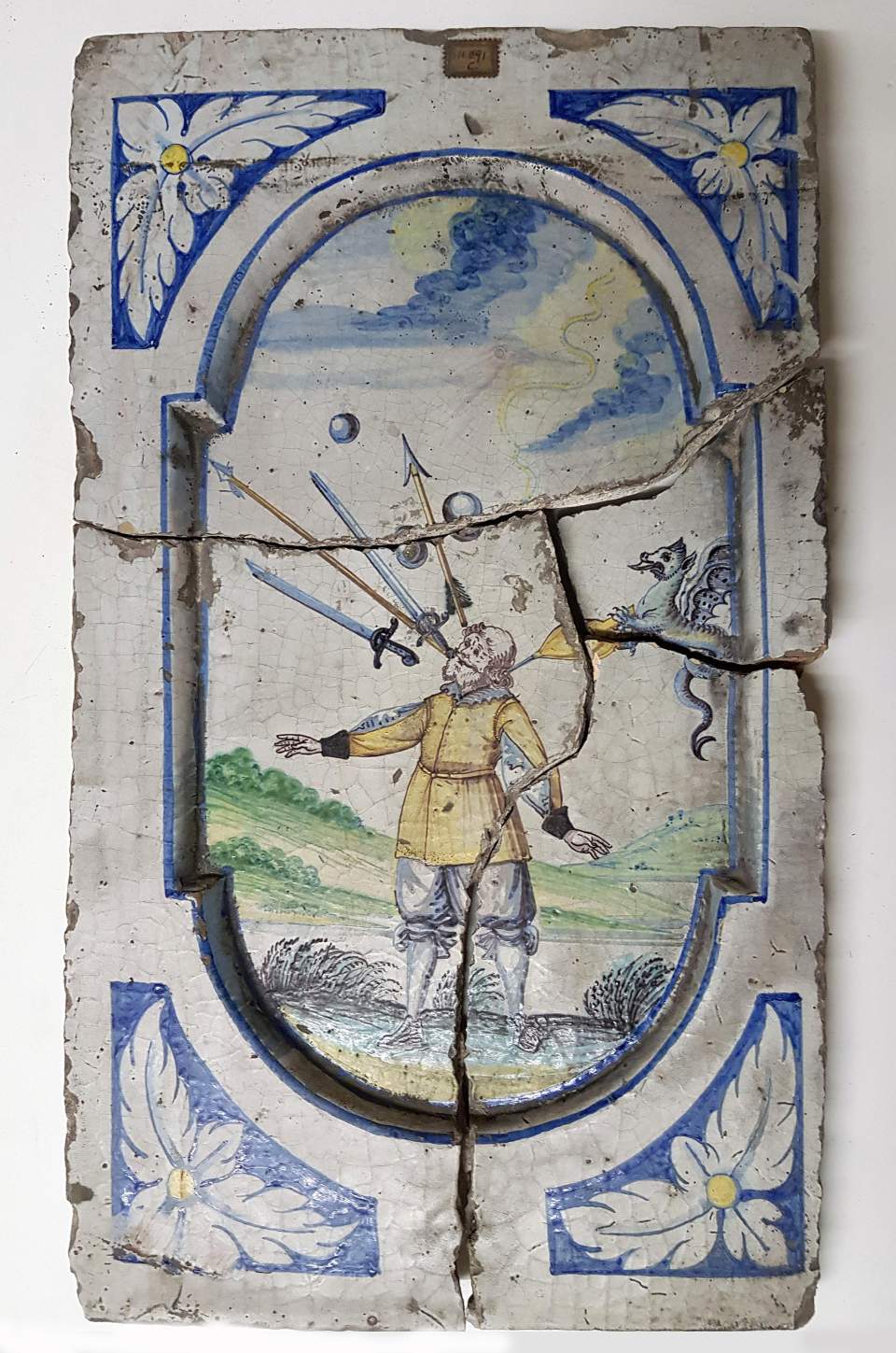 Ein weibliches Kompositwesen (wie es Conrad Meyer [1618–1689] gerne zeichnet; man beachte die Hörner zwischen den Pfauenfedern am Kopf!) fliegt von oben herbei und versucht mit einem als Buch gestalteten Blasbalg die Fackel vorzeitig zum Erlöschen zu bringen. Das ist besonders originell bzw. perfid, insofern als die Personifikation der Geschichte (Historia) gerne mit einem Buch dargestellt wird (in welches sie die Geschichten niederschreibt und so der Vergänglichkeit entzieht).