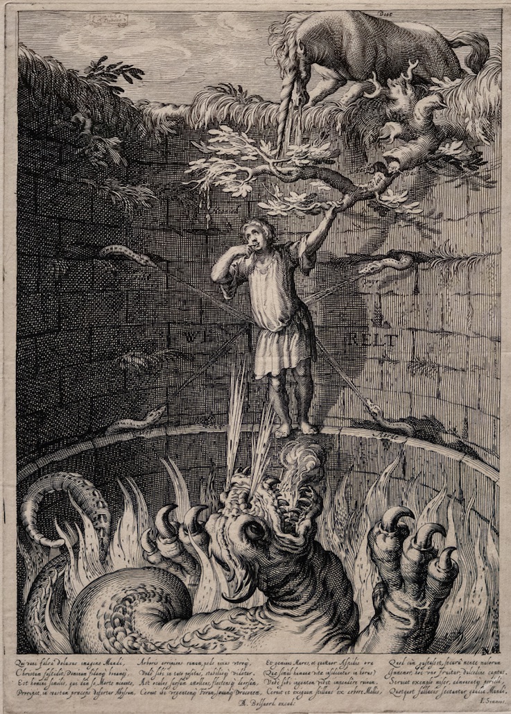 Von der ewigen Verdammnis. Barlaam erzählt, dass der Sünder einem Menschen gleiche, der – als er vor einem Einhorn floh – in einen Abgrund stürzte. Bei seinem Fall packte er mit den Händen einen kleinen Baum, der aus der Tiefe emporragte; und als er hinunterschaute, erblickte er am Fuße des Baumes einen scheusslichen Pfuhl und einen schrecklichen Drachen, der den Baum umschlängelte und mit offenem Rachen auf sein Herabfallen lauerte. Zwei Mäuse, eine weisse und eine schwarze, benagten den Baum unaufhörlich an der Wurzel, und er fühlte ihn schwanken. Vier weisse Schlangen, die aus dem Vorsprung, auf den er seinen Fuß fest eingestemmt hatte, hervorkamen, verpesteten die ganze Grube mit ihrem tödlichen Atem. Da hob er die Augen auf und erblickte einen Honigquell, der von den Ästen des Baumes herabtröpfelte, und er vergaß die Gefahr, die ihn von allen Seiten umgab, und überließ sich dem süßen Genuss. Als ihm aber ein Freund eine Leiter hinhielt, um ihm herauszuhelfen, hieß er ihn warten, von der Honigsüße berauscht, und stürzte, als der Baum fiel, in den Schlund des Drachen, der in den Pfuhl hinabkroch und ihn verschlang. So starb er eines jämmerlichen Todes.