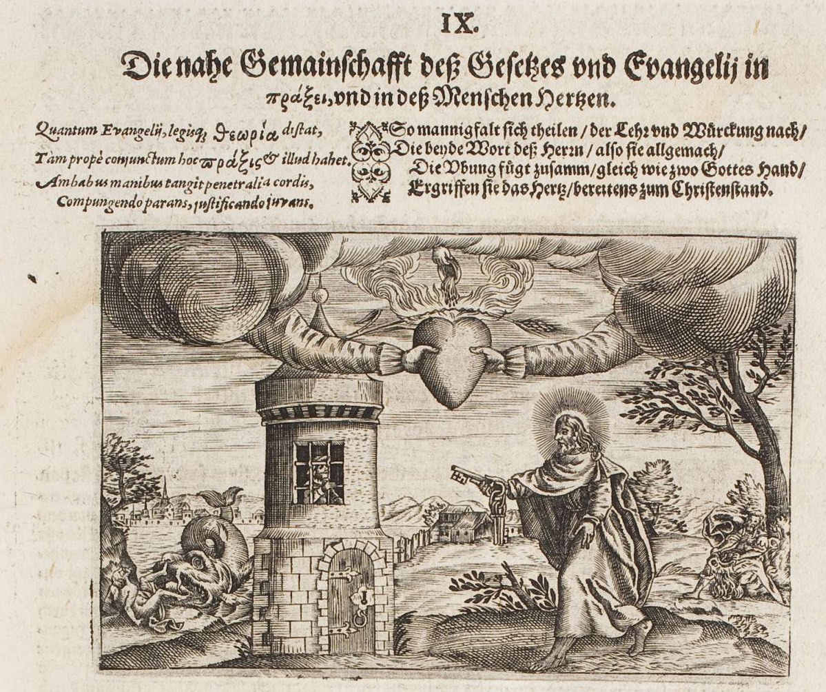 Zur Erläuterung das Emblem Nr. 20 aus Johann Arndt, »Vier Bücher vom Wahren Christentumb« (hier aus einer Ausgabe Stuttgart 1876). Der alte Baum trägt keine Früchte mehr, ist am Verdorren; die Propfreiser indessen schlagen aus, getrieben vom Saft des alten Baums.